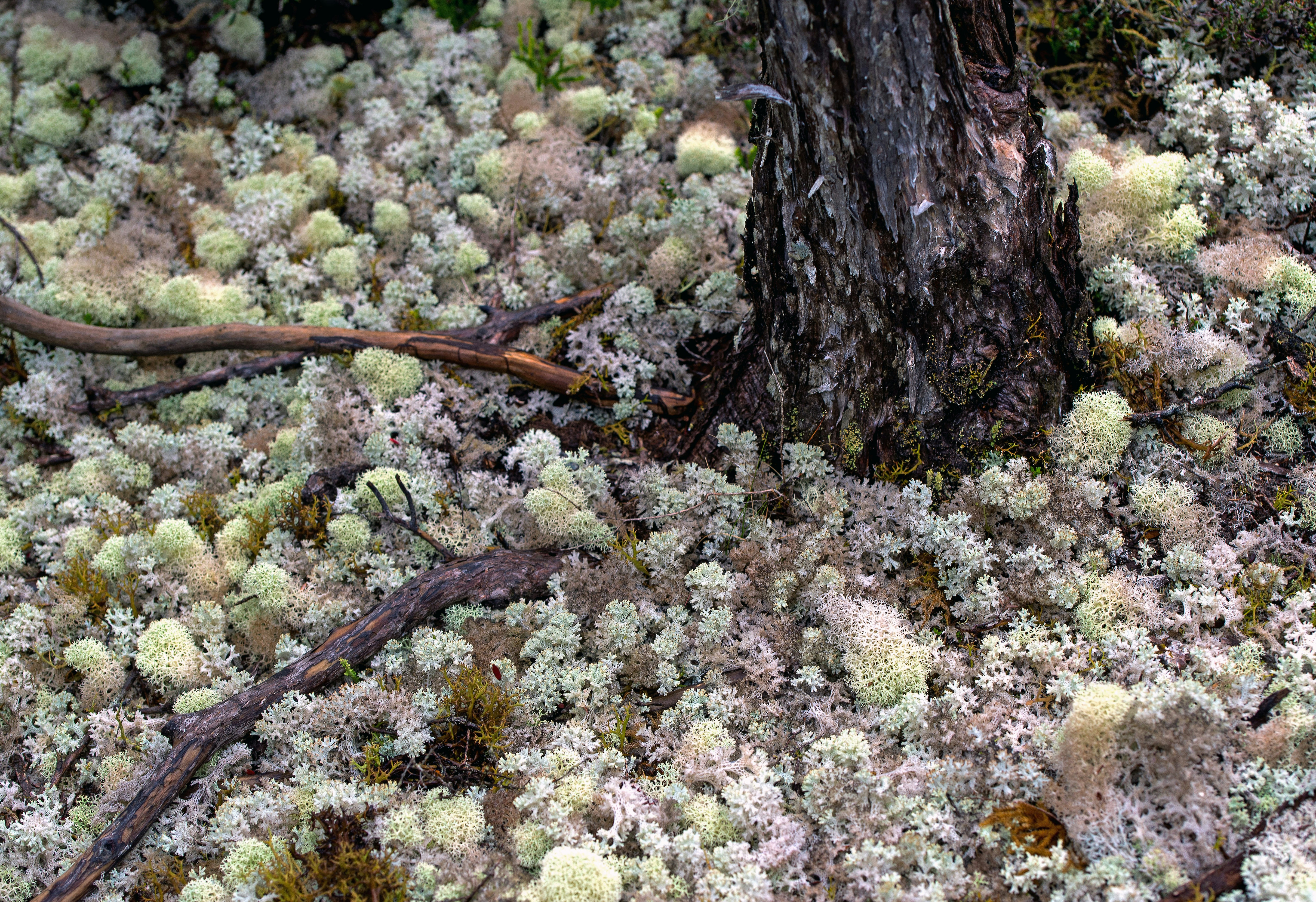 A carpet of lichen growing on the ground around the base of a small tree in the Goblin Forest, Tasmania, Australia.