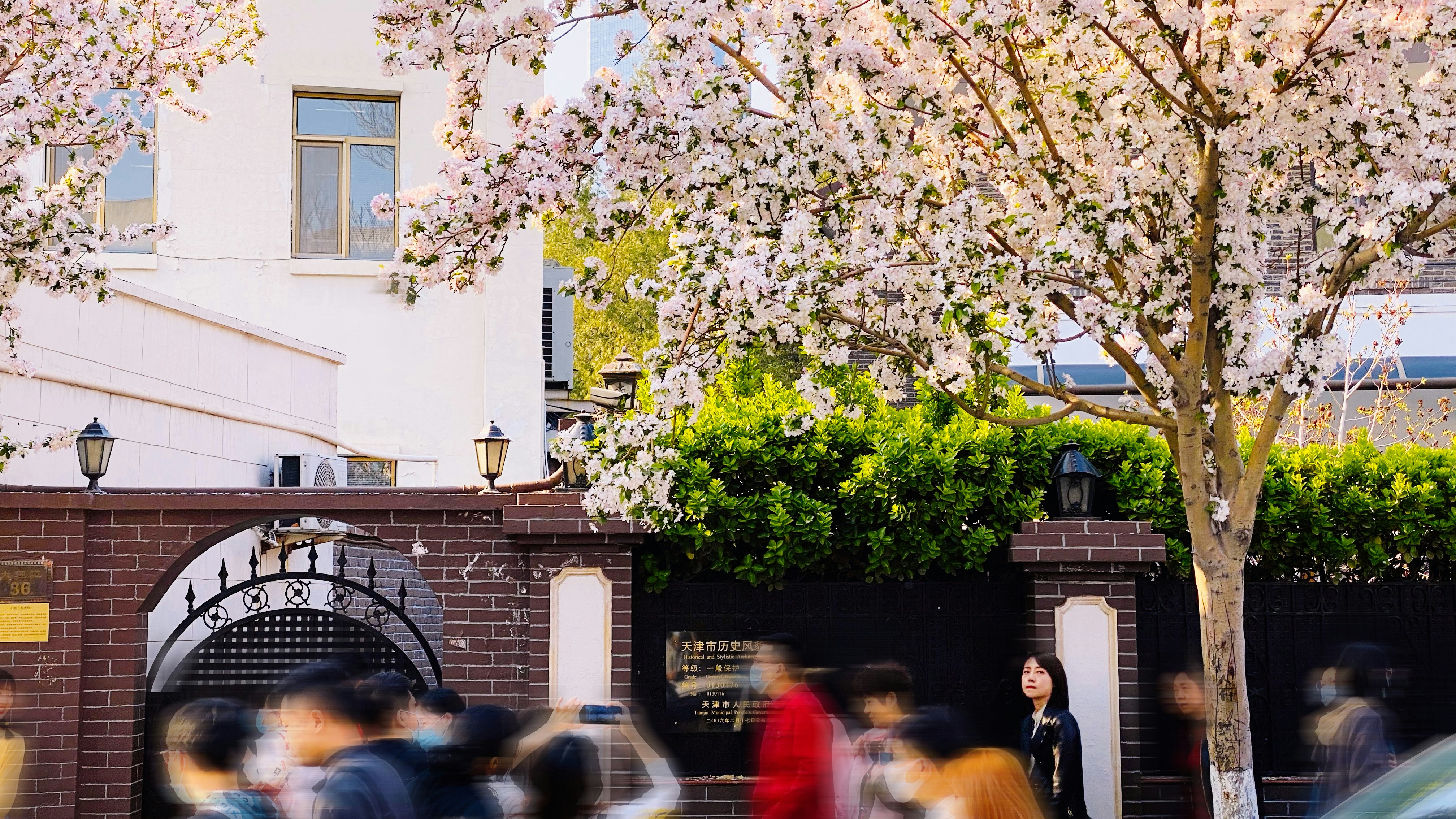 This photo was taken in April when the Malus spectabilis were in bloom. In the bustling crowd, a pure and kind girl stopped and looked up to enjoy the beautiful Malus spectabilis.