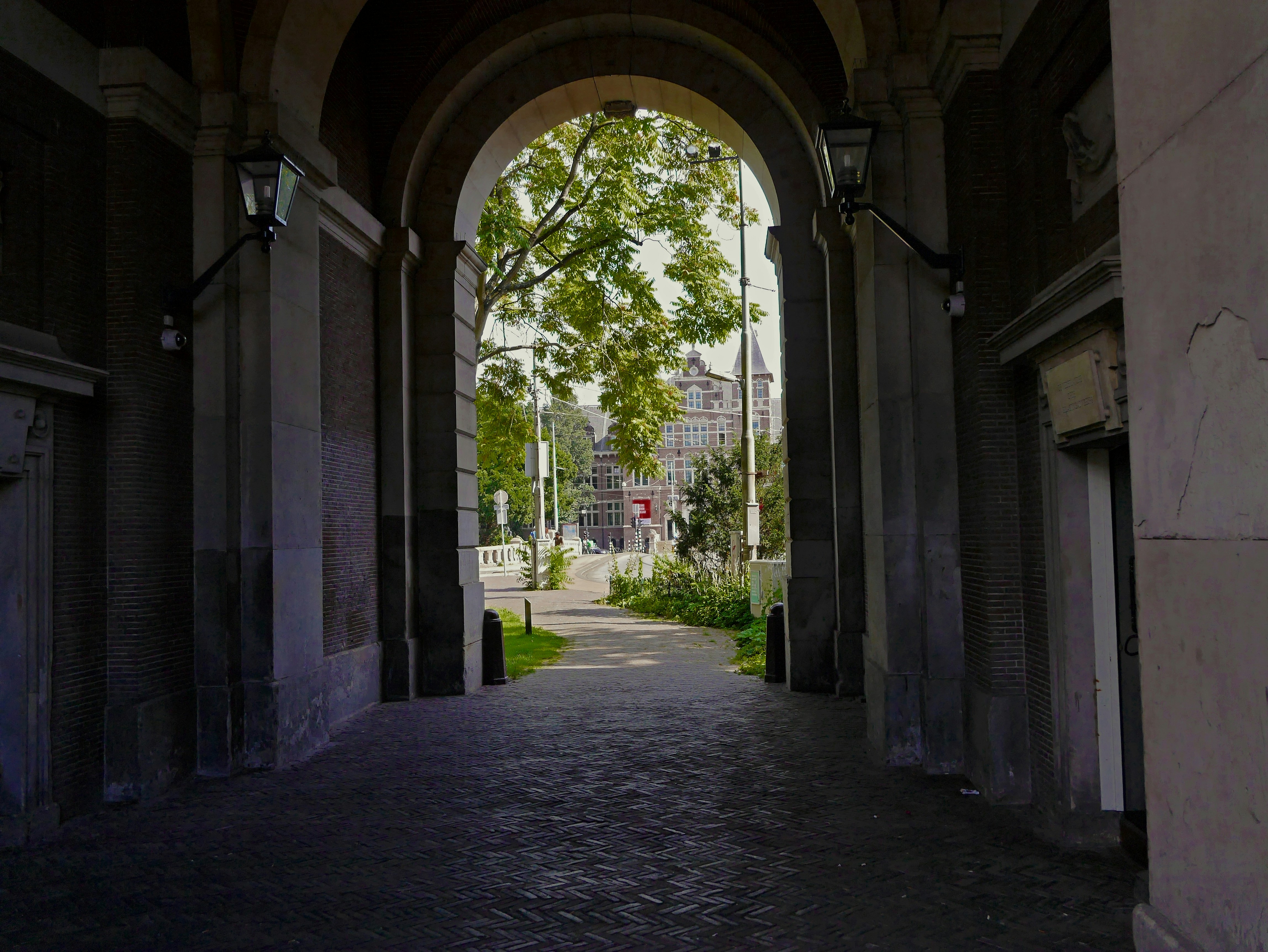 A view-through the interior of the old city gate in Amsterdam, a historical building; architecture built in 1770. The style of this gate is neoclassicism. Dutch free photo of July 2020, Fons Heijnsbroek of The Netherlands. Nederlands: gratis foto van de oude Muiderpoort in Amsterdam in zomerlicht van juli 2020. De poort geeft een mooie doorkijk op het Tropenmuseum met zijn torentjes. Het is architectuur van het neo-classicisme. Gratis foto van Fons Heijnsbroek, van Nederland, juli 2020