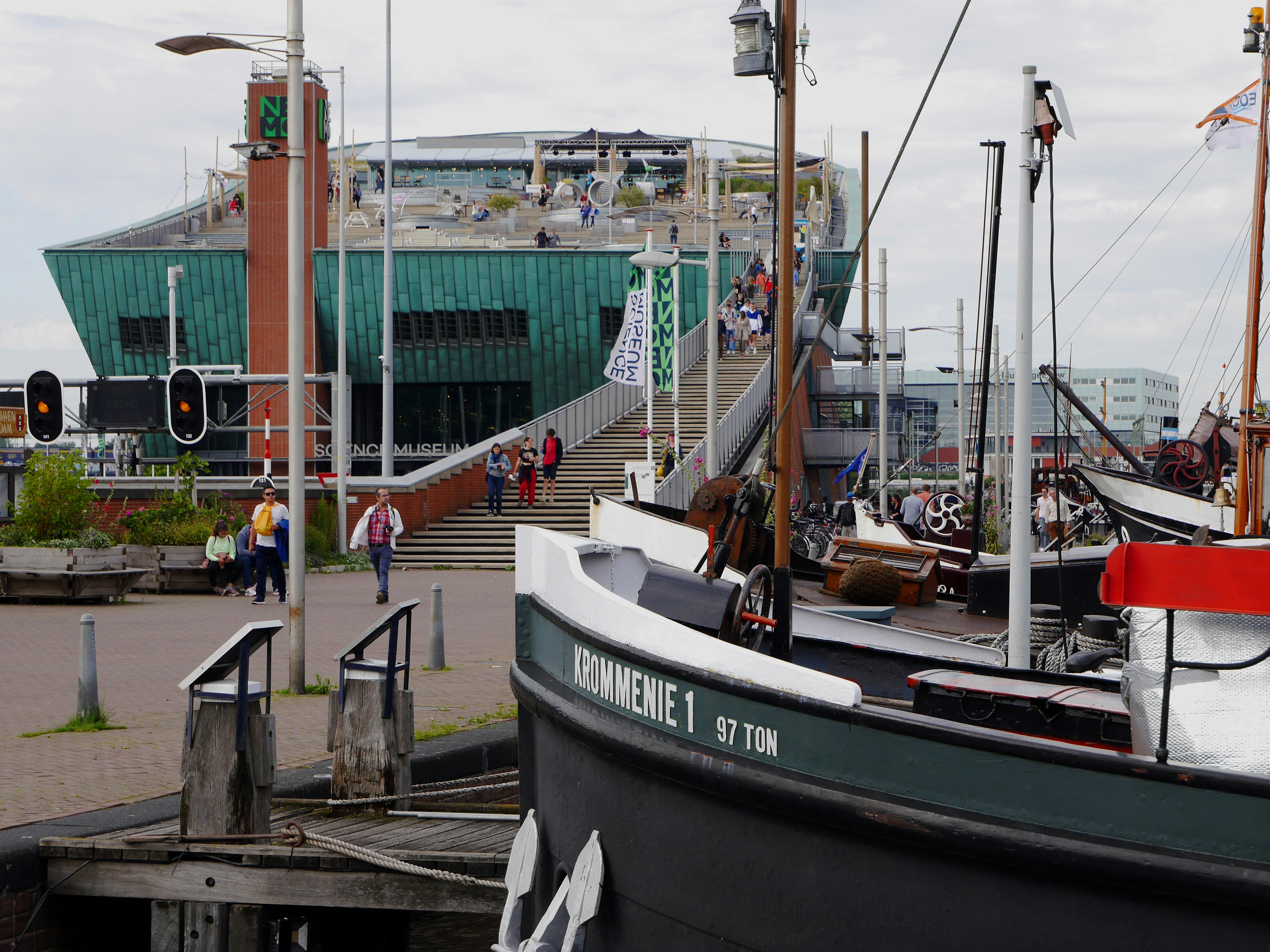 Urban picture of the NEMO museum and old ships and boats around the place, all in the Oosterdok water in Amsterdam city. Free photo of Fons Heijnbroek, 2020, Netherlands. Nederlands: gratis foto van oude boten en schepen van de Vereniging Museumhaven, opzij van het NEMO-museum op de IJtunnel, 2020 Nederland
