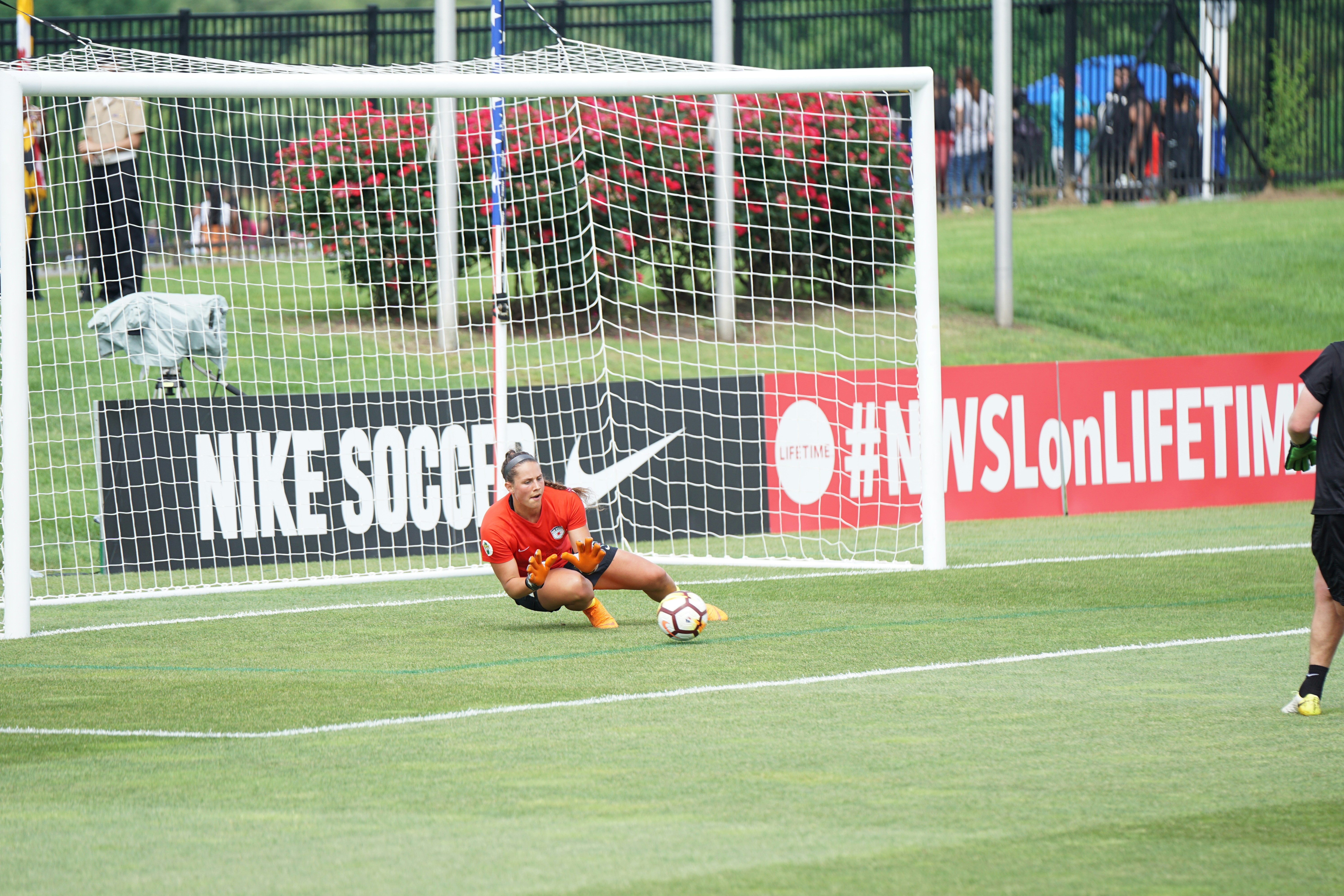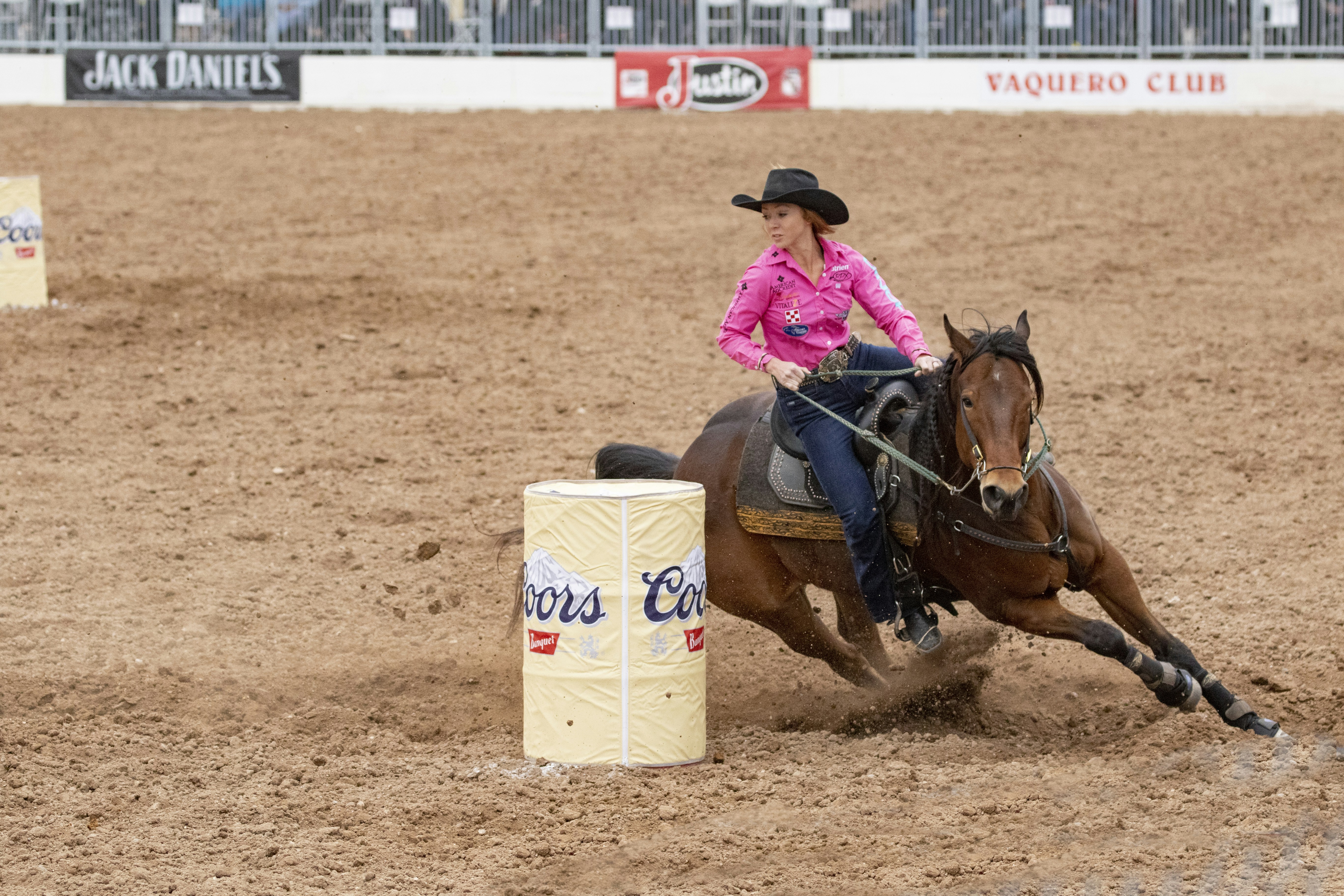 Emily Miller and her horse make a tight turn around a barrel before taking first place in barrel racing.