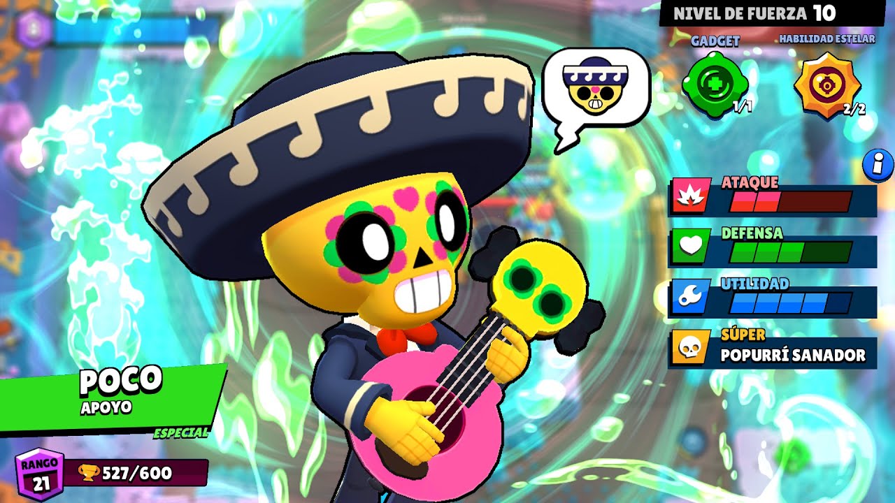 Poco is a Rare Brawler who has moderately high health and the ability to provide immense healing to his teammates, but very low damage. For his attack, Poco plays his guitarrón, sending damaging musical notes within a wide spread and range. His Super fires a larger and faster musical wave, healing himself and any allies within its range. His first Gadget, Tuning Fork, gives out a circular ...