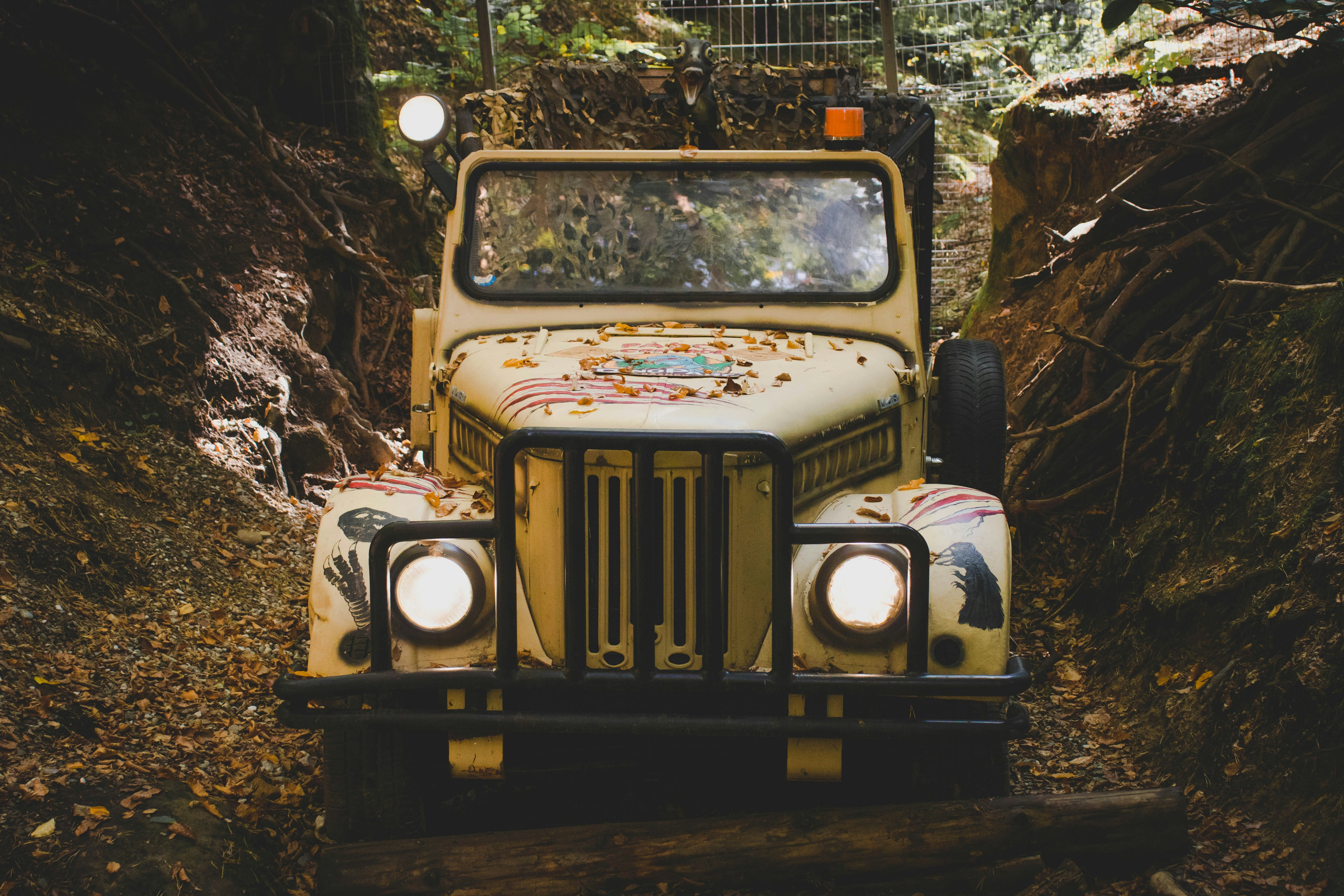 Dinosaur on top of an old abandoned car.